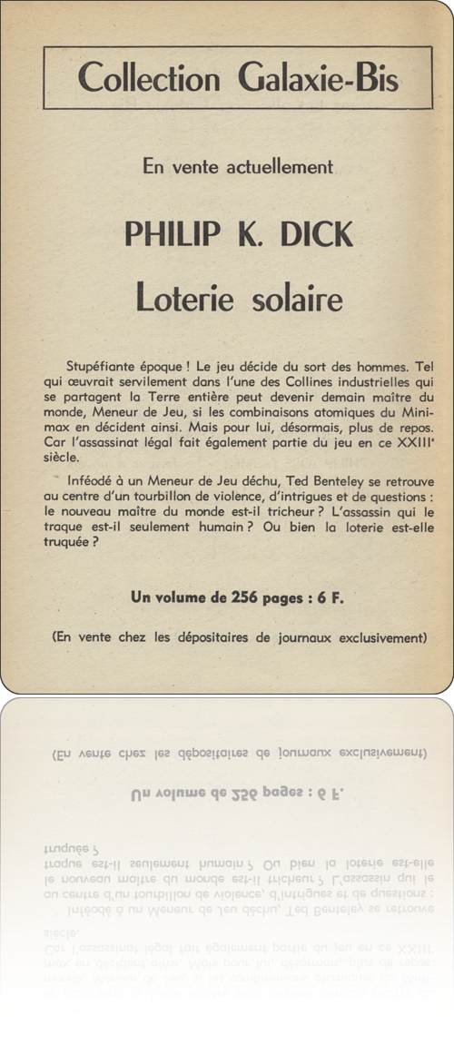 Voilà à peu près tout ce que j'ai pu apprendre sur Dick en consultant les jaquettes des ouvrages qu'il a publiés et les quelques articles écrits sur son compte. Fort peu de chose. Cette discrétion peut paraître paradoxale quand on sait le culte qui entoure bien vite un auteur de Science-Fiction, outre-Atlantique, et la diversité des exégèses à laquelle son œuvre donne lieu.