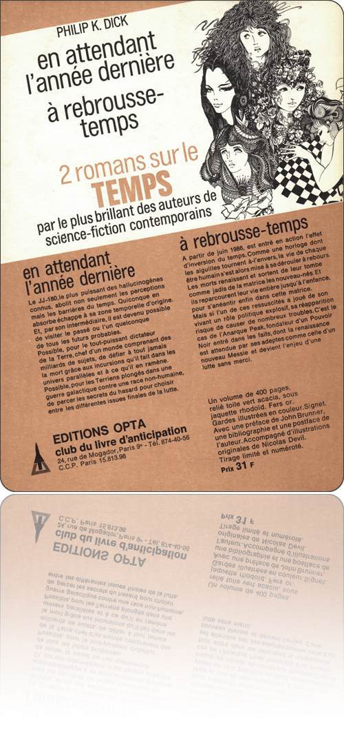 On voit également, ce qui sera parfaitement clair aux lecteurs d'En attendant l'année dernière et d'À rebrousse-temps, que le temps n'est pas dans l'œuvre de Dick une dimension physique, mais une dimension à la fois sociale et psychologique, plus précisément encore le type d'ordre par lequel l'individu s'insère dans la société, est contraint par elle, et duquel il parvient éventuellement à s'affranchir. Dick explicite franchement cette idée dans À rebrousse-temps en traitant un thème souvent esquissé mais jamais vraiment employé par ses prédécesseurs, celui du retournement du sens du temps physique : ce retournement ne change rien aux relations établies entre les êtres et les groupes sociaux. Les seules valeurs qui ont peut-être un sens, et qui sont ici portées par l'Anarque Peak, transcendent le temps physique. Incidemment, et sur un plan beaucoup plus trivial, je ne résiste pas l'envie de livrer aux lecteurs de Fiction l'étymologie du mot "sogum" qui sert à désigner cette substance (en réalité, les excréments) qu'absorbent pour se nourrir les personnages d'À rebrousse-temps : il s'agit, selon moi, des premières syllabes de Sodome et Gomorrhe.