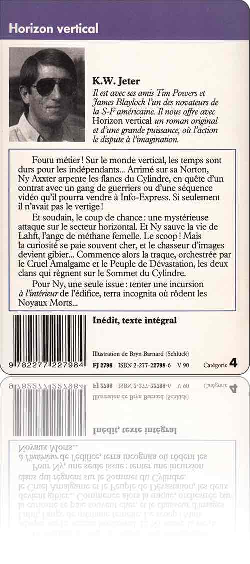 Ce n'est pas tous les jours dimanche chez K.W. Jeter, écrivain protéiforme. Son inspiration en forme de tête chercheuse balaye tout le champ romanesque pour y trouver de quoi survivre. Il en résulte souvent de bons textes professionnels, rarement une œuvre qui émerge de la production courante. C'est le cas d'Horizon vertical chez J'ai lu, une manière d'exercice de style qui mériterait une médaille aux jeux olympiques de la SF. Évitant les pièges de la récurrence et de la redondance, Jeter démarre sur une idée originale : un monde cylindrique où l'homme doit se déplacer verticalement, arrimé à la surface afin de ne pas céder à l'attraction vers le bas.