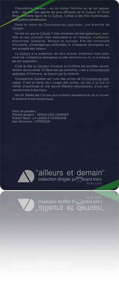 Heureusement, de source autorisée, l'Usage des armes fait partie d'un ensemble de quatre volumes, repris de ses œuvres passées, qui composent une étude en gris du futur à long terme. Ce roman ne constituant qu'un des éléments de cette mosaïque cryptée qui fait le charme de son écriture, nul doute que nous jouirons bientôt, en ordre dispersé, du plaisir d'en savoir plus sur Iain M. Banks et ses univers.