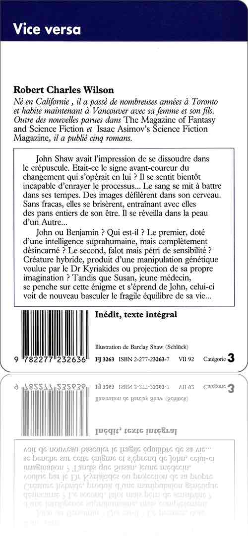 Vice versa, le roman d'un nouveau venu, Robert Charles Wilson, se présente comme la métaphore du chef-d'œuvre de Stevenson et de celui d'Olaf Stapledon : Odd John, publié en France au début des années 50 sous le titre de Rien qu'un surhomme. Il raconte l'histoire d'un mutant fragile et génial, si parfait qu'il ne peut croire en son destin tellement ce qu'il sait des Humains l'incite à désespérer. Sa souffrance se nomme réel ordinaire. Ordinaire qui frappe à la porte de la fiction pour détruire le bel agencement intellectuel du surdoué. D'abord, à cause de Woodward, son père adoptif, qui lui a rogné les ailes chaque fois qu'il a voulu s'envoler ; de Max Kyriakides, ensuite, dont l'abandon dramatique l'a sonné dès le premier round ; accessoirement de Roch, l'imbécile de frère d'Amélie, avec laquelle il vit lorsqu'il se prend pour Benjamin. Surtout de la vie, cette maladie qui le ronge, et de son génie, comme une éponge assoiffée de sublime.