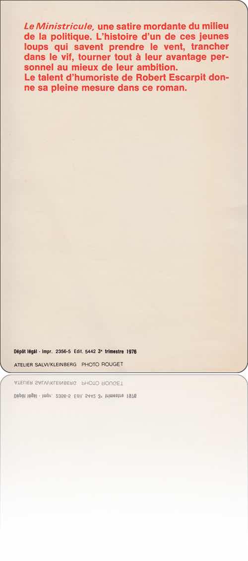 Dix ans plus tard, Escarpit a donné une suite au Littératron, le Ministricule, qui reprend les mêmes personnages (à quelques nouveaux venus près, comme Quincaille et Friedenhof) et se situe à nouveau dans le présent, avec de longs passages expliquant certains parcours individuels au travers de Mai 1968 et de la présidence Pompidou. Il y a même quelques allusions à l'élection présidentielle de 1974 (qui s'était jouée entre Giscard d'Estaing, Chaban-Delmas et Mitterrand). En un sens, on a un roman de “journalisme secret” plus que de SF ! Escarpit donne l'impression de recycler, voire de ressasser, son œuvre précédente, ce qui ôte beaucoup de sel au livre. On retrouve les mêmes trahisons, politiques et amoureuses, avec toujours le personnage d'hyperambitieuse d'Huguette Bréal, qui réalise ses rêves au travers de ses amants (dont il faut qu'ils aient envie de devenir ministres). Cela commence avec Le Guern faisant réaliser le télé-olétron, qui fonctionne, mais dont les grandes compagnies pétrolières s'assurent qu'il ne soit pas, ou guère, employé, pour ne pas faire baisser les cours des hydrocarbures. Mais Le Guern est un temps employé par Fermigier du Chausson (grand patron et propriétaire de presse) à proposer des pots-de-vin dans les quelques dictatures où le procédé est discrètement mis en œuvre… On rencontre aussi au passage une autre invention remarquable, la Mirobolette : « il s'agit de lunettes dont les verres sont remplacés par des écrans de télévision […] cela permet de voir un spectacle télévisé en couleurs et en relief » (p. 95), et le promoteur de la chose lui promet un grand avenir, en particulier de remplacer le papier (malheureusement le récit ne revient guère sur la Mirobolette).
