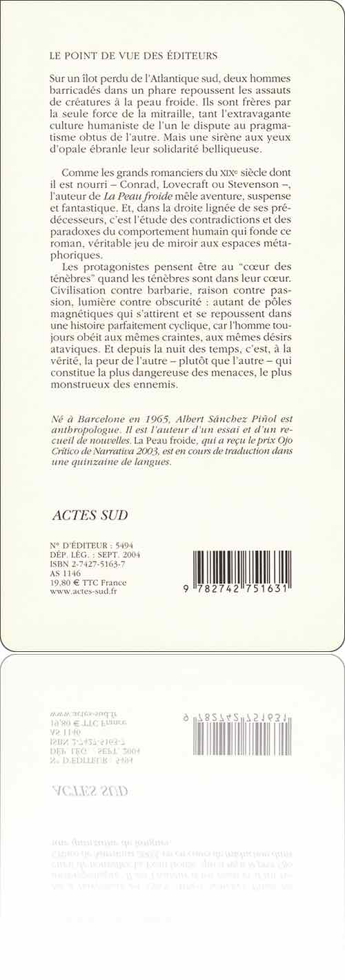 Une scène extraite de l'album Monstruo de Carlos Huante aurait peut-être mieux convenu à la couverture de la Peau froide que le détail des Carcans de Leonor Fini qui l'illustre présentement. L'actuelle femme-poisson — qui correspond sans doute mieux à l'image habituellement véhiculée par les publications d'Actes Sud — est bien un personnage du roman mais l'impression de sérénité ingénue qu'elle communique n'a pas de place plus loin lorsque l'on a ouvert le livre et commencé la lecture. Presqu'immédiatement, on est plongé dans un bruit et une fureur d'Apocalypse, dans des scènes de terreur et de massacre dignes du forum des Halles un samedi après-midi si l'on veut s'autoriser une parabole, une allégorie.