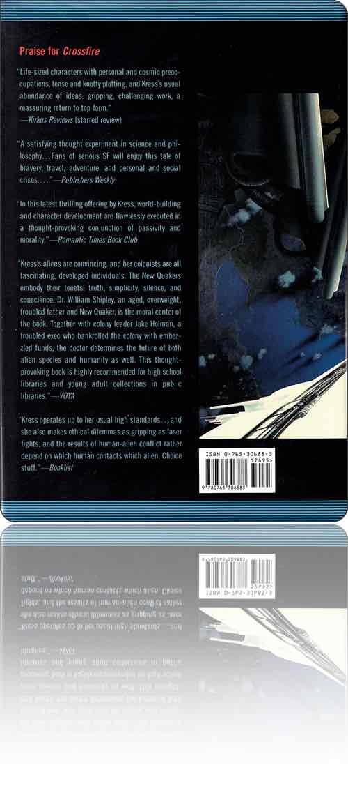 Crucible (paru en 2004 et non traduit à ce jour) fait suite à Crossfire et se passe environ quarante ans plus tard. C'est la fête du cinquantième anniversaire de l'arrivée des colons sur Greentrees et les inquiétudes provoquées par la guerre entre les deux espèces d'extraterrestres, les Vignes et les Fourrures, sont presque oubliées. Les années passant sans l'ombre d'une menace du ciel, les grands projets de mise en place de défenses de la planète présentés à la fin de Crossfire ont été pratiquement abandonnés. Mira City est devenue une vraie ville avec une vraie vie, des commerces, des industries, de la politique, des regroupements plus ou moins ethniques, et… forcément, des frictions entre les habitants, pour les raisons habituelles. Certains colons d'origine chinoise se sentent relégués à une position inférieure du fait qu'ils étaient au départ moins riches que les autres groupes, et ont donc moins d'influence, moins de possibilités de monter dans l'échelle sociale, ce qui aboutit à la formation d'une bande de dissidents aux agissements violents. Alex Cutler, descendante de Gail Cutler, fondatrice de la colonie, fait partie des dirigeants. Jake Holman, l'autre fondateur, est toujours vivant, mais très vieux et physiquement très affaibli, même si son cerveau est encore fidèle au poste. C'est une des caractéristiques intéressantes du livre que d'avoir un vieillard cacochyme comme protagoniste important et actif. (Nancy Kress est coutumière du fait, sa nouvelle "the Erdmann nexus" parue dans Asimov's, qui a gagné le prix Hugo 2009 de la meilleure novella, est aussi une histoire de vieux qui sont encore utiles à quelque chose…)(1)