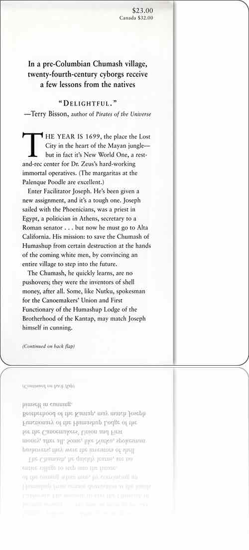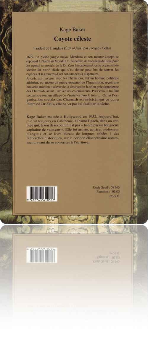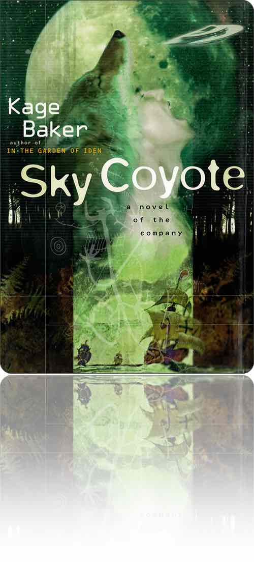 Après la première aventure de Mendoza qui se passe en l'Angleterre vers 1550 (voir In the garden of Iden pour comprendre de quoi il s'agit), on se retrouve quelque part dans le Nouveau Monde en 1699, où les cyborgs immortels se préparent à fêter, de manière grandiose, le passage à l'année 1700. Cette fois, c'est Joseph qui raconte l'histoire dans Sky Coyote. On découvre donc, par bribes, d'où il vient, comment il a été recruté par la Compagnie et un peu de ce qu'il y fait depuis plusieurs milliers d'années… Le début du roman se passe dans une sorte de station de villégiature cachée dans la jungle où les immortels se reposent, travaillent et mettent au point leurs diverses missions. On apprend comment ils vivent, comment ils s'amusent, et aussi un certain nombre de choses — plus ou moins mystérieuses — sur la Compagnie elle-même. La “mission”, cette fois, va se dérouler dans ce qui deviendra la Californie, peu de temps avant l'arrivée de l'homme blanc et son cortège de catastrophes. Il s'agit de déplacer un village entier d'Indiens Chumash, avec leur accord et leur coopération et sans les traumatiser. Ce pour sauver ce qui peut l'être de leur vie, de leur environnement et de leur culture. Mendoza fait partie du groupe mais restera toujours plus ou moins en retrait. En fait, sa présence et son comportement ne peuvent avoir de sens que si on a d'abord lu le premier volume. Les personnages principaux sont les Indiens. Joseph va devoir être grimé (avec des prothèses élaborées) pour pouvoir passer pour Sky Coyote, un des dieux, futé, menteur mais pas méchant, de leur mythologie. Mais les Chumash sont loin d'être des sauvages primitifs. Ils ont des syndicats, un système économique évolué avec une monnaie et une vision fort rationnelle du monde. Il n'est donc pas aisé de leur faire prendre des vessies pour des lanternes. Baker réussit à présenter ses Indiens de la (future) Californie précolombienne de façon originale et sans les stéréotypes habituels.