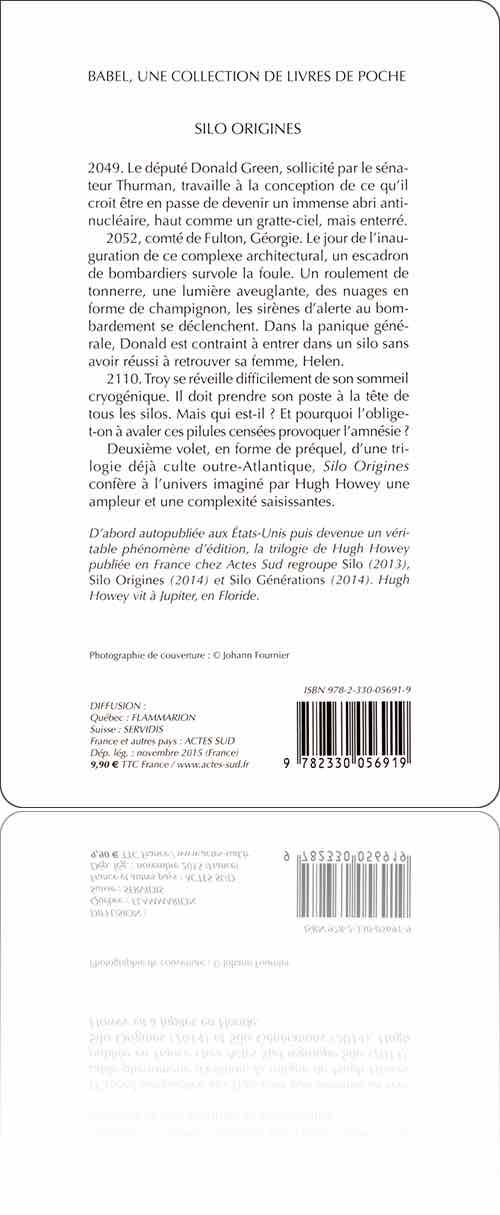 Hugh HoweyOriginesdans l'édition : Actes Sud › Babel, nº 1352, 2015[ 1 ] [ 2 ]de :Hugh Howeytitre :Originessous une couverture de :Johann Fournierédition :France › Arles : Actes Sud › Babel, nº 1352type, date et codification :volume simple, novembre 2015 (octobre 2015), ISBN 978-2-330-05691-9description matérielle :640 pages, broché, 11×18 cmpar ailleurs :actes-sud.framazon.frnotice :frxlii9oa46UmNWlneF9RhFc7Ipw1gmE7contenutextes : 1fiction : 1rédactionnel : 0francophone : 0traduit : 15‑625 → Hugh Howey : Origines (2013 [2012-2013] ↬ 2014)