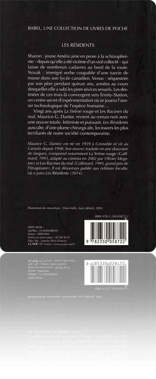 Maurice G. Dantecles Résidentsdans l'édition : Actes Sud › Babel noir, nº 152, 2015[ 1 ] [ 2 ]de :Maurice G. Dantectitre :les Résidentssous une couverture de :Dino Vallsédition :France › Arles : Actes Sud › Babel noir, nº 152type, date et codification :volume simple, janvier 2016 (décembre 2015), ISBN 978-2-330-05872-2description matérielle :688 pages, broché, 11×18 cmpar ailleurs :actes-sud.framazon.frbnf.frnotice :frxlii1YXURTYbGOYtoI3sUdkTNlFHZfucontenutextes : 1fiction : 1rédactionnel : 0francophone : 1traduit : 05‑681 → Maurice G. Dantec : les Résidents (2014 [2013])