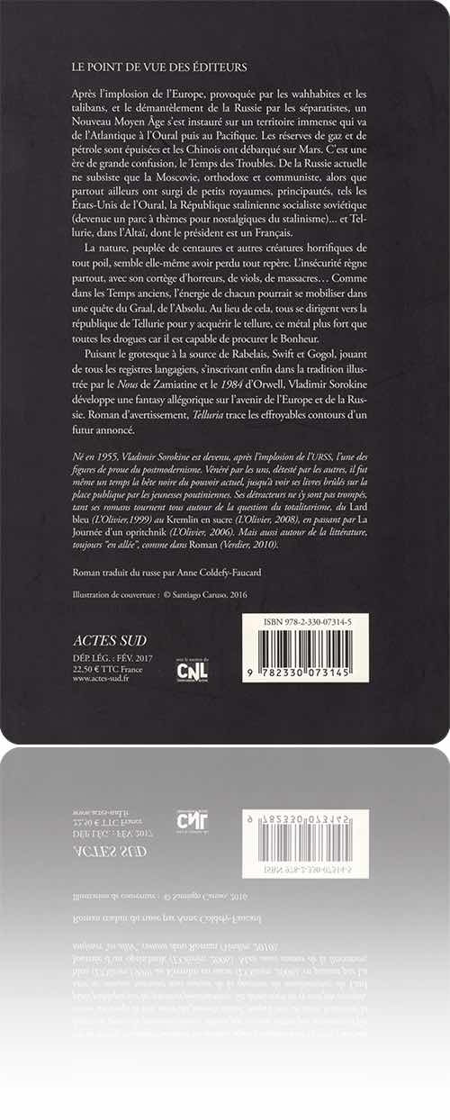 Vladimir SorokineTelluriadans l'édition : Actes Sud › Exofictions, 2016[ 1 ] [ 2 ]de :Vladimir Sorokinetitre :Telluriasous une couverture de :Santiago Carusoédition :France › Arles : Actes Sud › Exofictionstype, date et codification :volume simple, février 2017 (décembre 2016), ISBN 978-2-330-07314-5description matérielle :352 pages, broché, 14×24 cmpar ailleurs :actes-sud.framazon.frbooks.google.frnoosfere.orgnotice :frxliifUI8NzigbjUalHFWpf1IXLJ1vXjcontenutextes : 1fiction : 1rédactionnel : 0francophone : 0traduit : 13‑350 → Vladimir Sorokine : Telluria (2013 ↬ 2016)