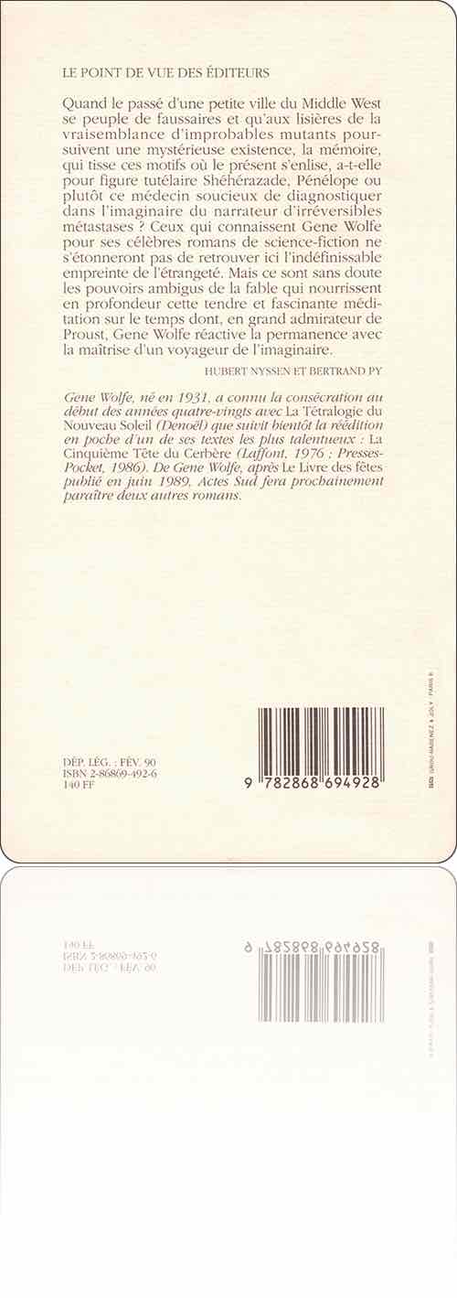 Gene WolfePeacedans l'édition : Hubert Nyssen/Actes Sud › Lettres anglo-saxonnes, 1990[ 1 ] [ 2 ]de :Gene Wolfetitre :Peacesous une couverture de :René Magritteédition :France › Arles : Hubert Nyssen/Actes Sud › Lettres anglo-saxonnestype, date et codification :volume simple, février 1990 (janvier 1990), ISBN 2-86869-492-6description matérielle :252 pages, broché, 12×22 cmpar ailleurs :actes-sud.framazon.frbnf.frbooks.google.frnotice :frxliixfMRPl5ltinHsfVST1uvK3PzoPocontenutextes : 1fiction : 1rédactionnel : 0francophone : 0traduit : 15‑341 → Gene Wolfe : Peace (1975 ↬ 1990)