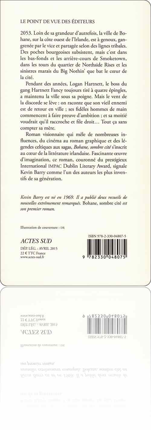 Kevin BarryBohane, sombre citédans l'édition : Actes Sud, 2015[ 1 ] [ 2 ]de :Kevin Barrytitre :Bohane, sombre citésous une couverture de :[Anonyme]édition :France › Arles : Actes Sud › [sans collection]type, date et codification :volume simple, avril 2015 (mars 2015), ISBN 978-2-330-04807-5description matérielle :336 pages, broché, 11×22 cmpar ailleurs :actes-sud.framazon.frbnf.frbooks.google.frnoosfere.orgnotice :frxliidVz67orw8Ebdtm6Gw1ExeWjwoqIcontenutextes : 1fiction : 1rédactionnel : 0francophone : 0traduit : 15‑327 → Kevin Barry : Bohane, sombre cité (2011 ↬ 2015)