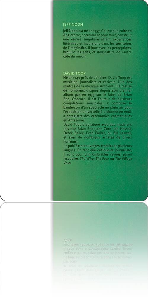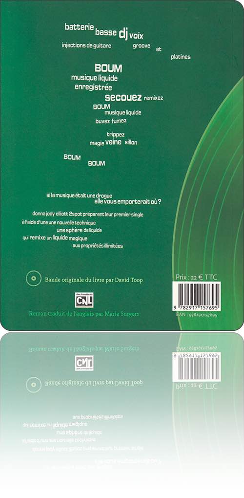 Conception graphique de Stéphanie Aparicio. Pour être complet, ce livre doit être accompagné sous le deuxième rabat du disque compact musical de la “bande originale du livre” : Needle in the groove par David Toop. Le service de presse était accompagné d'un prière d'insérer.