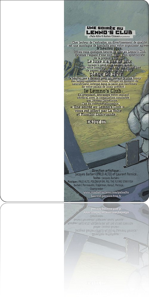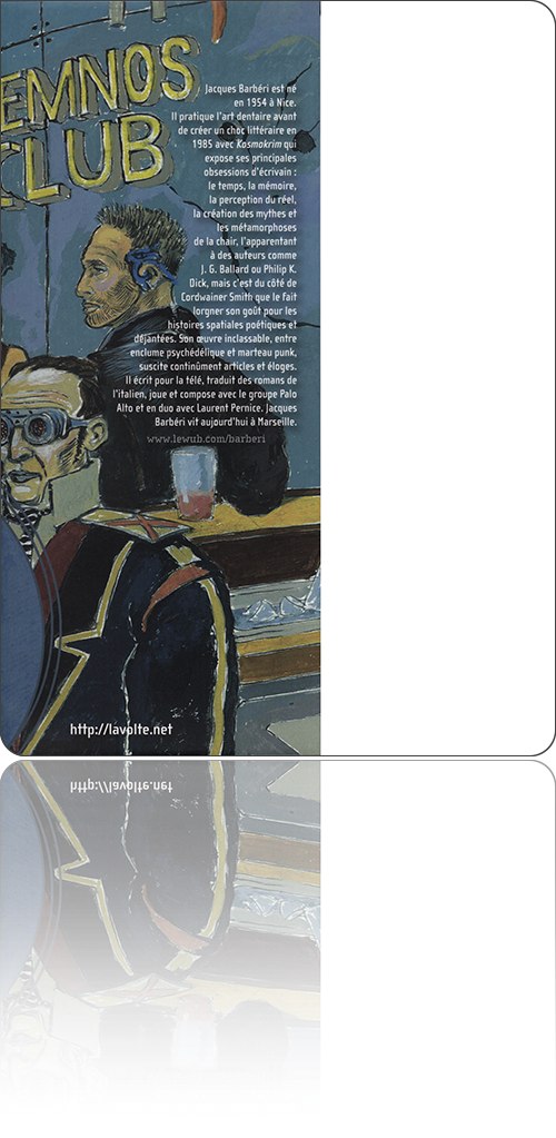Conception graphique de Stéphanie Aparicio. Comporte une nouvelle version du roman et une bibliographie. Pour être complet, ce livre doit être accompagné sous le deuxième rabat du disque compact musical de la “bande originale du livre” : une Soirée au ‘Lemno's Club’. Le service de presse était lui-même accompagné d'un prière d'insérer.