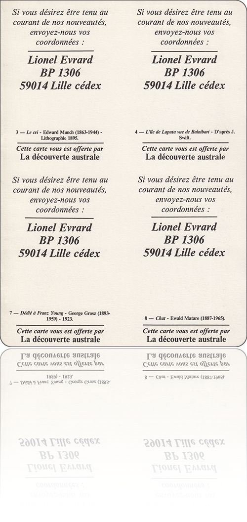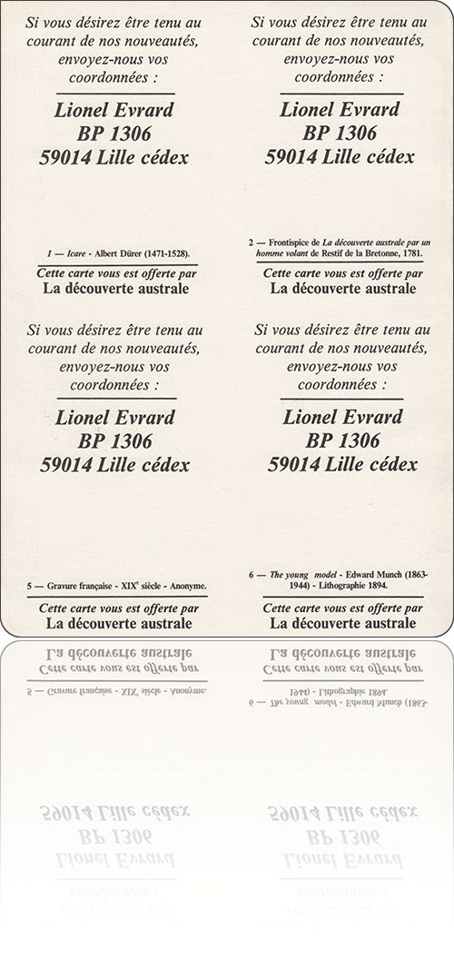 la Découverte australeà : Lillepublications à titre personnel[ 1 ] [ 2 ] [ 3 ] [ 4 ]nom :la Découverte australetype et codification :publications à titre personnel, préfixe ISBN non codifiélieu de publication :France › Lillepériode d'activité :septembre 1984 → décembre 1987fondé par :Lionel Évrardnotice :frxliioPEwhcLFhSRmPFgi0GEcvG2EEh7Collections[hors collection](la Découverte australe : septembre 1984 → décembre 1987), dirigée par : Lionel Évrard