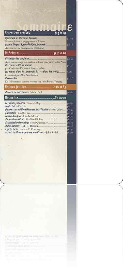 Direction artistique d'Aurélien Police. Le numéro d'ISBN correspond aux éditions ActuSF, membre du collectif d'édition les Indés de l'Imaginaire donc la revue est une production. À l'occasion du changement de formule de la revue avec ce numéro, un dossier de presse présentait les nouvelles orientations.