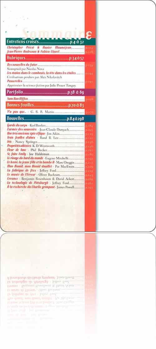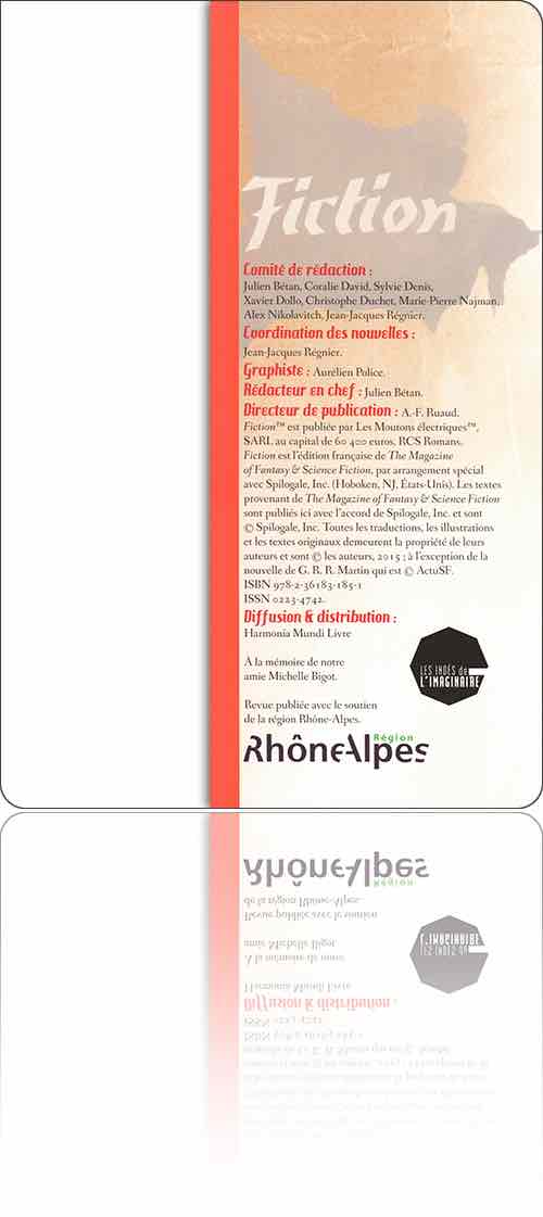 Direction artistique d'Aurélien Police. Le numéro d'ISBN correspond aux éditions les Moutons électriques, membre du collectif d'édition les Indés de l'Imaginaire donc la revue est une production. Ce volume a été publié grâce à un financement participatif dont la liste des contributeurs est donnée en dernières pages, après un portfolio succinct des couvertures de la revue de 1953 à 2015. Le supplément en ligne propose les rubriques qui étaient déjà prêtes pour les numéros suivants, lesquels n'ont pas paru en raison de l'arrêt de la revue d'ailleurs annoncé dans l'éditorial.