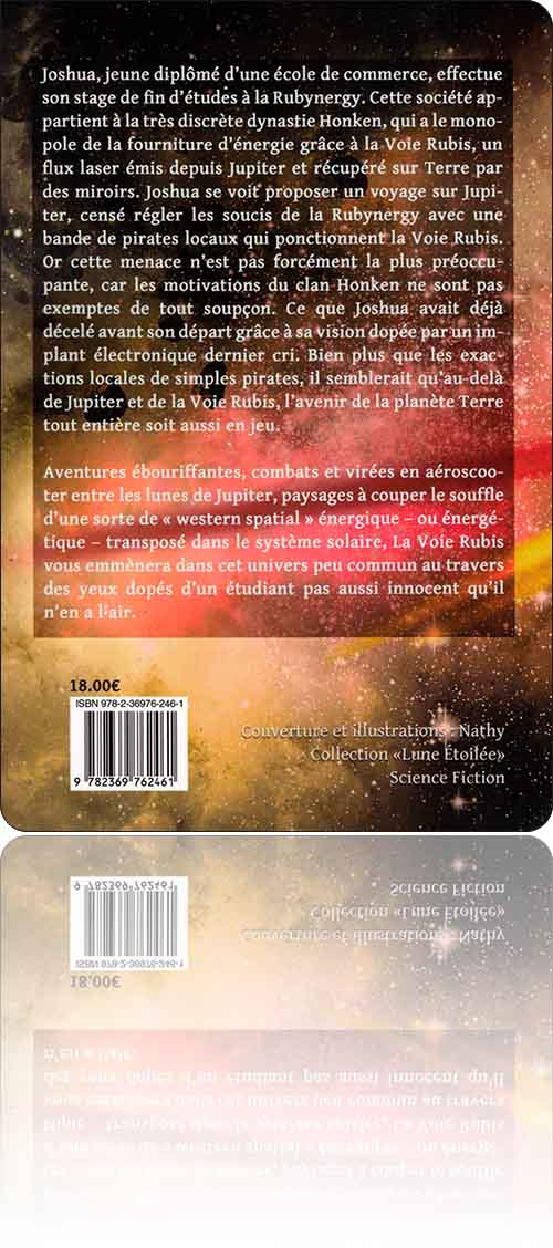 Jean-Michel Calvezla Voie Rubisdans l'édition : Lune écarlate › Lune étoilée, 2017[ 1 ] [ 2 ]de :Jean-Michel Calveztitre :la Voie Rubissous une couverture de :Nathyédition :France › Montluçon : Lune écarlate › Lune étoiléetype, date et codification :volume simple, mai 2017 (avril 2017), ISBN 978-2-36976-246-1description matérielle :270 pages, broché, 15×23 cmpar ailleurs :amazon.frlune-ecarlate.comnotice :frxliiAeJDTOyjYSK97IfhJRsozAm81yocontenutextes : 1fiction : 1rédactionnel : 0francophone : 1traduit : 03‑263 → Jean-Michel Calvez : la Voie Rubis (2008, version révisée)
