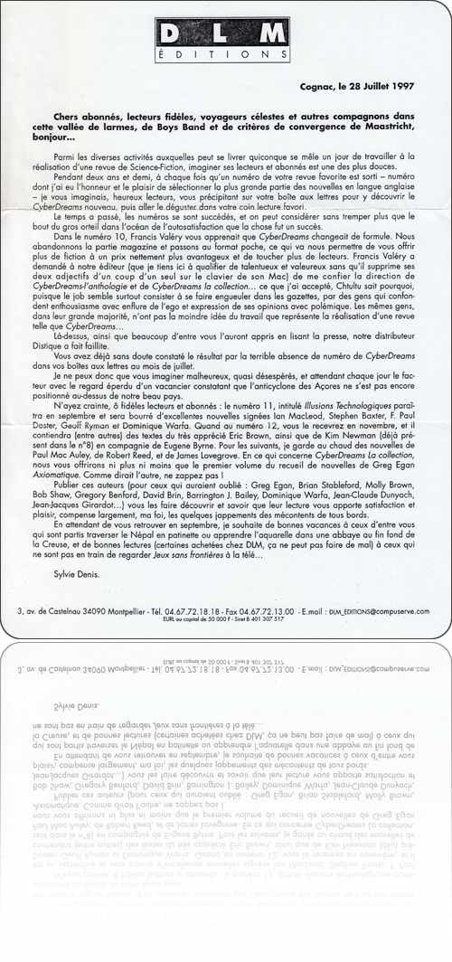 Continuation, six mois plus tard et sous forme d'anthologie périodique, de CyberDreams › la revue sous l'unique direction de Sylvie Denis, laquelle annonce par courrier (ci-contre) cette transformation aux abonnés en juillet 1997. Deux volumes en tout, numérotés 11 (Illusions technologiques) & 12 (Destins parallèles), le 13 (les Extraterrestres sont de retour) n'ayant pas été imprimé, et le 14 (Futurs lointains) pas été finalisé (on sait tout au moins qu'il devait contenir "l'Ultime territoire" de Jean-Jacques Nguyen & Thomas Day). L'ISSN 1264-1324 porté par les numéros de cette anthologie périodique correspond en fait à "CyberDreams" › la collection grand format. ¶ La publication reprendra vingt et un ans plus tard en juillet 2018 avec la deuxième série de CyberDreams › la revue, relancée par Francis Valéry dans l'optique