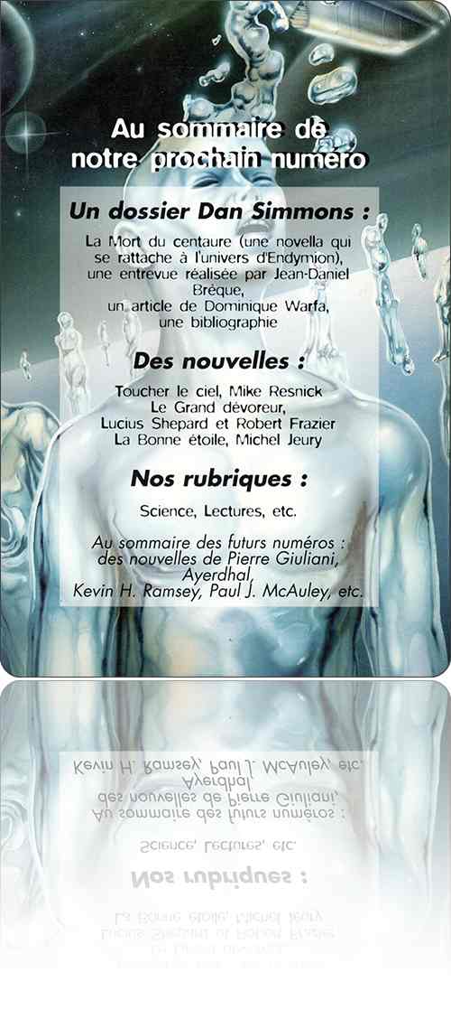 Dossier Iain M. Banks se résumant simplement à deux textes de celui-ci suivis de sa très courte bibliographie française de l'époque. Comporte, en fin de volume, une présentation du Forum de l'IFRAS à l'occasion de ses dix ans ainsi qu'une liste des cinquante souscripteurs de la revue tels que présentés dans l'éditorial et à qui elle doit une partie de son capital.
