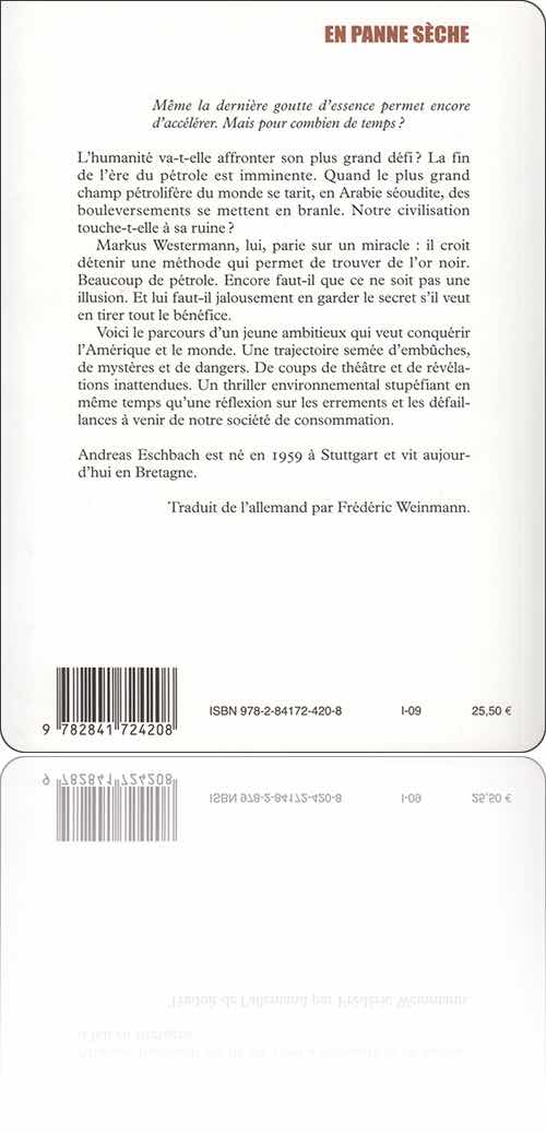 Andreas EschbachEn panne sèchedans l'édition : l'Atalante › Insomniaques et ferroviaires, 2009[ 1 ] [ 2 ]de :Andreas Eschbachtitre :En panne sèchesous une couverture de :Matthias Kulkaédition :France › Nantes : l'Atalante › Insomniaques et ferroviairestype, date et codification :volume simple, janvier 2009 (février 2009), ISBN 978-2-84172-420-8description matérielle :768 pages, broché, 14×20 cmpar ailleurs :amazon.frbnf.frl-atalante.comnoosfere.orgnotice :frxliioRwODyeQKpDOn3j6nVYc6ic98ALcontenutextes : 1fiction : 1rédactionnel : 0francophone : 0traduit : 15‑763 → Andreas Eschbach : En panne sèche (2007 ↬ 2009)