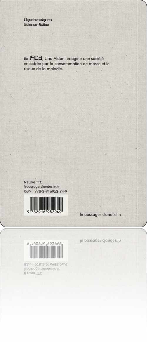 Lino Aldani37° centigradesdans l'édition : le passager clandestin › Dyschroniques, 2013[ 1 ] [ 2 ]de :Lino Aldanititre :37° centigradessous une couverture de :Xavier Sebillotteédition :France › Neuvy-en-Champagne : le passager clandestin › Dyschroniquestype, date et codification :volume commenté, deuxième trimestre 2013 (juin 2013), ISBN 978-2-916952-94-9description matérielle :96 pages, broché, 11×17 cmpar ailleurs :amazon.frlepassagerclandestin.frnoosfere.orgnotice :frxliipK0qHCLFjNRUvrsZE9M8LzDGV2Scontenutextes : 1fiction : 1rédactionnel : 0francophone : 0traduit : 13‑80 → Lino Aldani : 37° centigrades (1963 ↬ 1964)