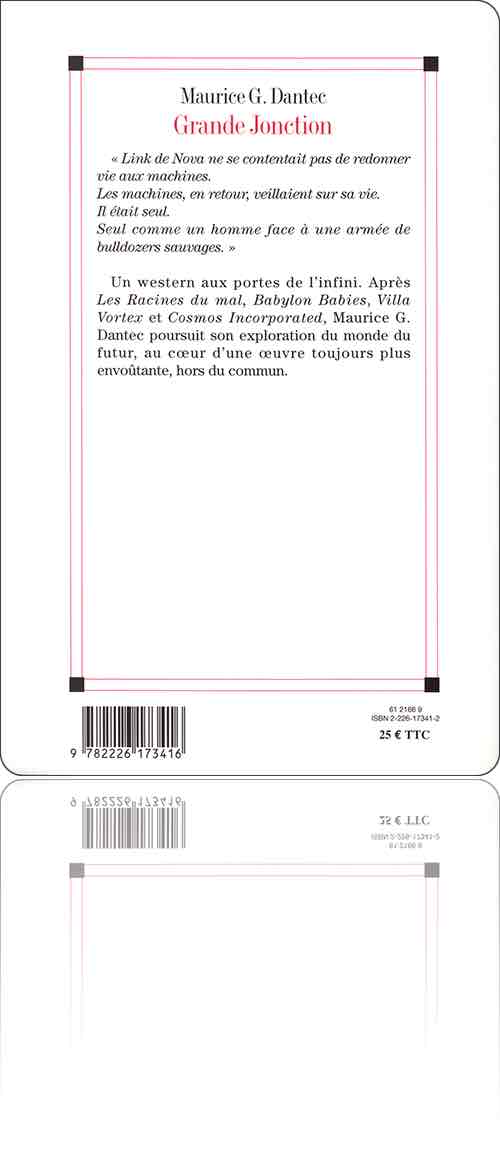 Maurice G. DantecGrande jonctiondans l'édition : Albin Michel, 2006[ 1 ] [ 2 ] [ 3 ] [ 4 ]de :Maurice G. Dantectitre :Grande jonctionsous une couverture de :Tanino Liberatoreédition :France › Paris : Albin Michel › [sans collection]type, date et codification :volume simple, août 2006 (juillet 2006), ISBN 2-226-17341-2description matérielle :784 pages, broché avec jaquette, 14×22 cmpar ailleurs :albin-michel.framazon.frbnf.frbooks.google.frnoosfere.orgnotice :frxliiwFzuaI7dvlHViIbtBBjBzIlpxlfcontenutextes : 1fiction : 1rédactionnel : 0francophone : 1traduit : 05‑775 → Maurice G. Dantec : Grande jonction (2006)