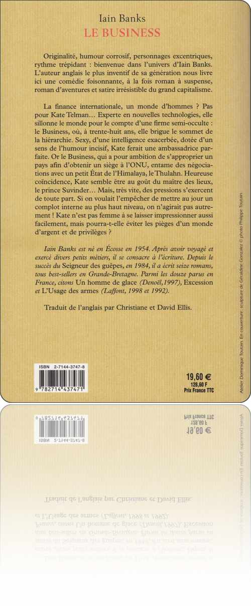 Iain Banksle Businessdans l'édition : Belfond › Littérature étrangère, 2001[ 1 ] [ 2 ] [ 3 ] [ 4 ] [ 5 ] [ 6 ]de :Iain Bankstitre :le Businesssous une couverture de :Philippe Toutain & Géraldine Gonzalezédition :France › Paris : Belfond › Littérature étrangèretype, date et codification :volume simple, septembre 2001, ISBN 2-7144-3747-8description matérielle :444 pages, broché avec jaquette, 14×23 cmpar ailleurs :amazon.frbnf.frbooks.google.frlisez.comnoosfere.orgnotice :frxliiuiqaD4lFn1PoNO661veDVliLTgRcontenutextes : 1fiction : 1rédactionnel : 0francophone : 0traduit : 15‑437 → Iain Banks : le Business (1999 ↬ 2001)