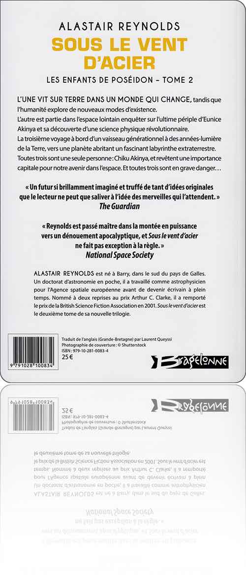 Alastair ReynoldsSous le vent d'acierdans l'édition : Bragelonne › SF, 2016[ 1 ] [ 2 ]de :Alastair Reynoldstitre :Sous le vent d'aciersous une couverture de :[Anonyme]édition :France › Paris : Bragelonne › SFtype, date et codification :volume simple, août 2016 (juillet 2016), ISBN 979-10-281-0083-4description matérielle :552 pages, broché, 15×24 cmpar ailleurs :amazon.frbnf.frbooks.google.frbragelonne.frnoosfere.orgnotice :frxliieJANDgROBwtETIsVmT4DwjHdta5contenutextes : 1fiction : 1rédactionnel : 0francophone : 0traduit : 13‑550 → Alastair Reynolds : Sous le vent d'acier (2013 ↬ 2016)