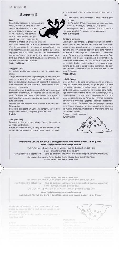 Bulletin d'actualités contenant, de manière exceptionnelle et pour fêter son centième numéro, une anthologie de textes de cent mots (sur le thème dudit nombre) éparpillés sur l'ensemble de ses pages.