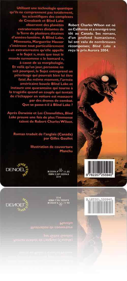 Robert Charles WilsonBlind Lakedans l'édition : Denoël › Lunes d'encre, 2005[ 1 ] [ 2 ]de :Robert Charles Wilsontitre :Blind Lakesous une couverture de :Manchuédition :France › Paris : Denoël › Lunes d'encretype, date et codification :volume simple, novembre 2005 (octobre 2005), ISBN 2-207-25594-8description matérielle :432 pages, broché, 14×20 cmpar ailleurs :amazon.frbnf.frbooks.google.frdenoel.frnoosfere.orgnotice :frxlii6DcmSvT6AFCflBXxqUEUcZe1iTEcontenutextes : 1fiction : 1rédactionnel : 0francophone : 0traduit : 15‑415 → Robert Charles Wilson : Blind Lake (2003 ↬ 2005)