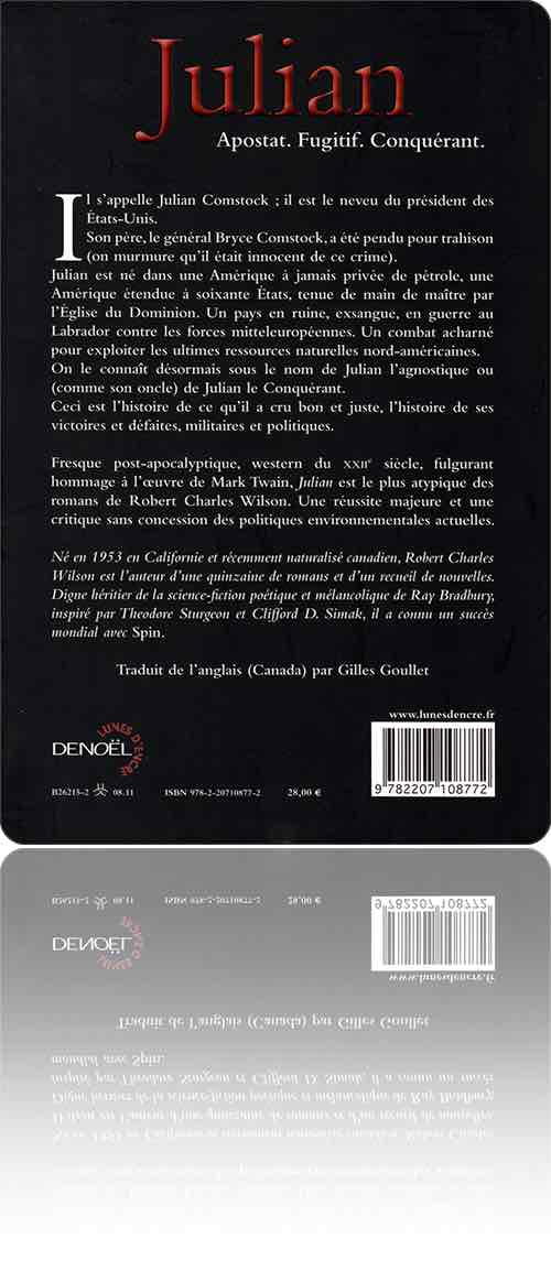 Robert Charles WilsonJuliandans l'édition : Denoël › Lunes d'encre, 2011[ 1 ] [ 2 ]de :Robert Charles Wilsontitre :Juliansous une couverture de :Jefferson Haymanédition :France › Paris : Denoël › Lunes d'encretype, date et codification :volume simple, juin 2011, ISBN 978-2-20710877-2 [978-2-207-10877-2]description matérielle :608 pages, broché, 15×23 cmpar ailleurs :amazon.frbnf.frbooks.google.frdenoel.frnoosfere.orgnotice :frxliio5myr1K2dOgaxcaoRTq42IcLqmzcontenutextes : 1fiction : 1rédactionnel : 0francophone : 0traduit : 15‑592 → Robert Charles Wilson : Julian (2009 ↬ 2011)