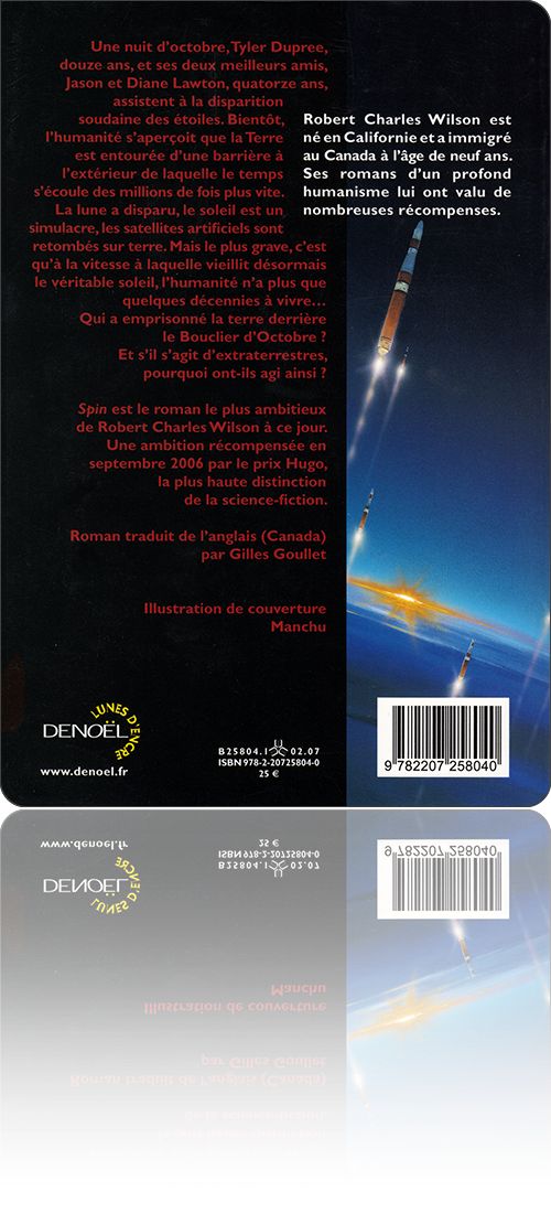 Robert Charles WilsonSpindans l'édition : Denoël › Lunes d'encre, 2007[ 1 ] [ 2 ]de :Robert Charles Wilsontitre :Spinsous une couverture de :Manchuédition :France › Paris : Denoël › Lunes d'encretype, date et codification :volume simple, février 2007 (1er février 2007), ISBN 978-2-20725804-0 [978-2-207-25804-0]description matérielle :560 pages, broché, 14×21 cmpar ailleurs :amazon.frbnf.frbooks.google.frdenoel.frnoosfere.orgnotice :frxliicetNTQHbdpEJtf3zOz1hhaQZ5N3contenutextes : 1fiction : 1rédactionnel : 0francophone : 0traduit : 15‑545 → Robert Charles Wilson : Spin (2005 ↬ 2007)