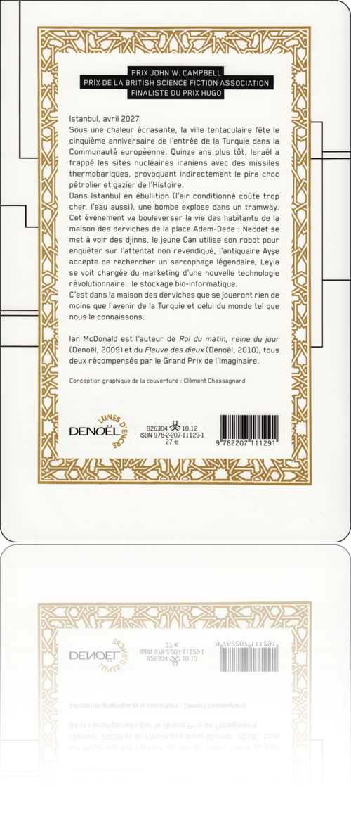 Ian McDonaldla Maison des dervichesdans l'édition : Denoël › Lunes d'encre, 2012[ 1 ] [ 2 ]de :Ian McDonaldtitre :la Maison des dervichessous une couverture de :Clément Chassagnardédition :France › Paris : Denoël › Lunes d'encretype, date et codification :volume simple, septembre 2012, ISBN 978-2-207-11129-1description matérielle :544 pages, broché, 15×23 cmpar ailleurs :amazon.frbnf.frdenoel.frnoosfere.orgnotice :frxliicIYVXOKUSWK8RYU6CtXYsAf71aIcontenutextes : 1fiction : 1rédactionnel : 0francophone : 0traduit : 15‑523 → Ian McDonald : la Maison des derviches (2010 ↬ 2012)