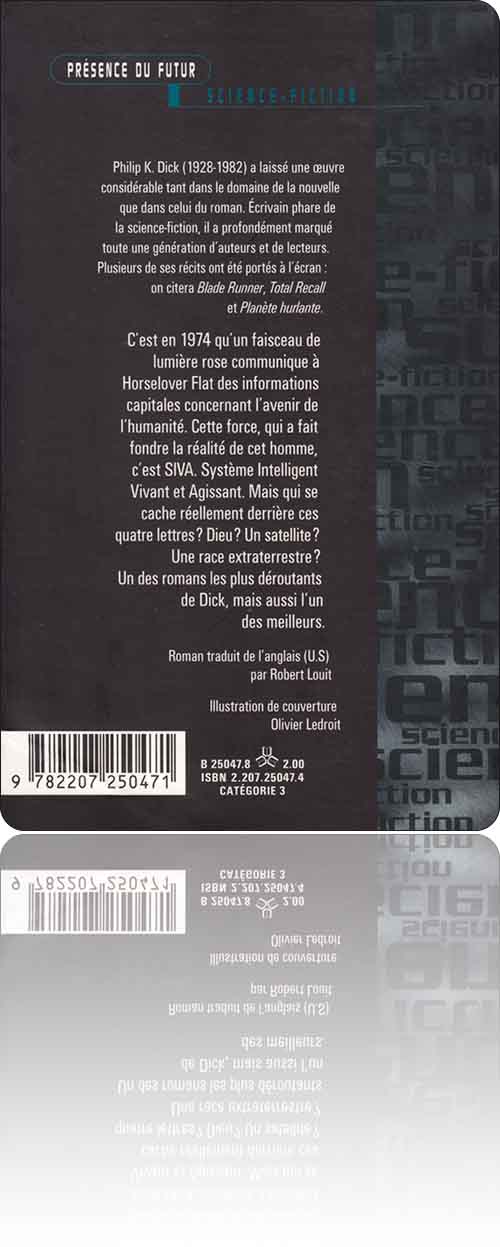 Philip K. DickSIVAdans l'édition : Denoël › Présence du futur › Science-Fiction, nº 317, 2000[ 1 ] [ 2 ]de :Philip K. Dicktitre :SIVAsous une couverture de :Olivier Ledroitédition :France › Paris : Denoël › Présence du futur › Science-Fiction, nº 317type, date et codification :volume simple, février 2000, ISBN 2-207-24578-0 [2-207-25047-4]description matérielle :256 pages, broché, 11×18 cmpar ailleurs :amazon.frnoosfere.orgnotice :frxliiei5OLi0q3t79HlbaCECZt39Gss7contenutextes : 1fiction : 1rédactionnel : 0francophone : 0traduit : 15‑251 → Philip K. Dick : SIVA (1981 [1978] ↬ 1981)