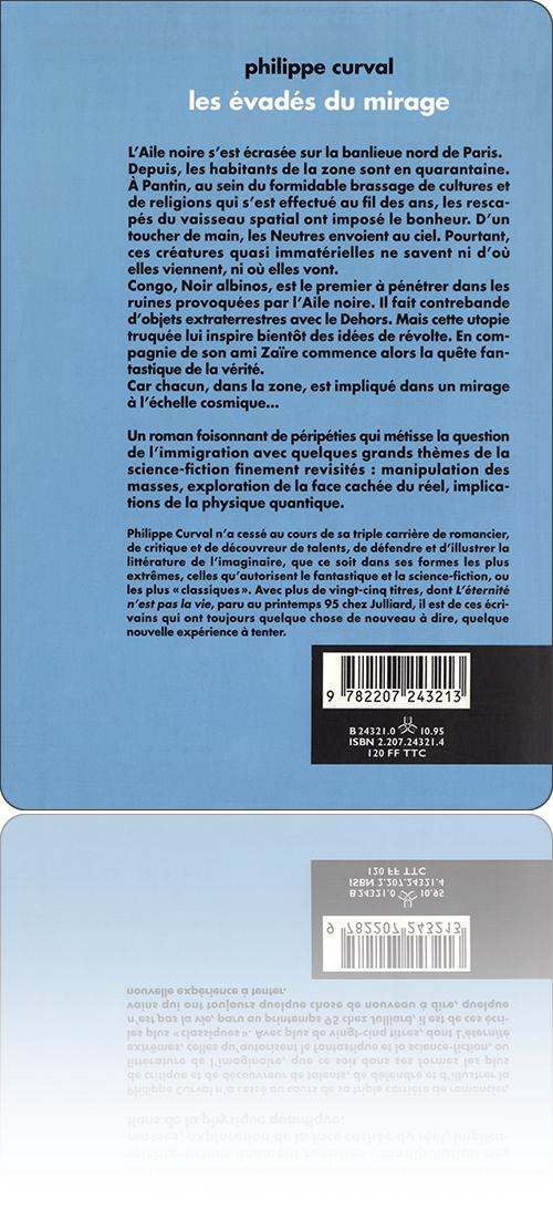 Philippe Curvalles Évadés du miragedans l'édition : Denoël › Présences, 1995[ 1 ] [ 2 ]de :Philippe Curvaltitre :les Évadés du mirageédition :France › Paris : Denoël › Présencestype, date et codification :volume simple, octobre 1995 (septembre 1995), ISBN 2-207-24321-4description matérielle :288 pages, broché, 14×20 cmpar ailleurs :amazon.frbnf.frbooks.google.frdenoel.frnoosfere.orgnotice :frxliij2eHpnfNuhTMt9GrNI1x88Tjjvycontenutextes : 1fiction : 1rédactionnel : 0francophone : 1traduit : 05‑281 → Philippe Curval : les Évadés du mirage (1995)