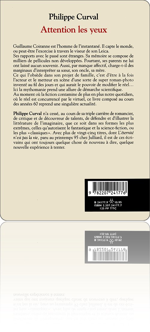 Philippe CurvalAttention les yeuxdans l'édition : Denoël, 1995[ 1 ] [ 2 ]de :Philippe Curvaltitre :Attention les yeuxsous une couverture de :Philippe Curvalédition :France › Paris : Denoël › [sans collection]type, date et codification :volume simple, octobre 1995 (septembre 1995), ISBN 2-207-24177-7description matérielle :224 pages, broché, 14×21 cmpar ailleurs :amazon.frbnf.frbooks.google.frdenoel.frnotice :frxliigWxLVMHFlsIPsSgBdHkbbsq51O6contenutextes : 1fiction : 1rédactionnel : 0francophone : 1traduit : 05‑223 → Philippe Curval : Attention les yeux › photo-roman (1972 [1968])