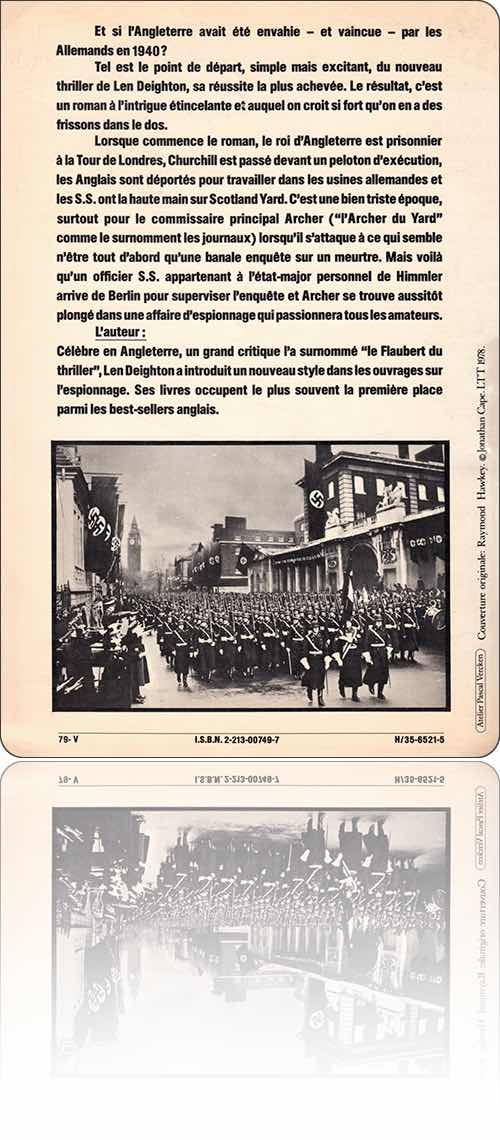 Len DeightonSS-GBdans l'édition : Fayard, 1979[ 1 ] [ 2 ]de :Len Deightontitre :SS-GBsous une couverture de :Raymond Hawkeyédition :France › Paris : Fayard › [sans collection]type, date et codification :volume simple, deuxième trimestre 1979 (23 mai 1979), ISBN 2-213-00749-7description matérielle :408 pages, broché, 16×23 cmpar ailleurs :amazon.frbnf.frnoosfere.orgnotice :frxliisCoUGzsSFE8tqOopgn5UbakaHSucontenutextes : 1fiction : 1rédactionnel : 0francophone : 0traduit : 1‑5‑399 → Len Deighton : S.S.-G.B. : les Allemands ont envahi l'Angleterre (1978 ↬ 1979)