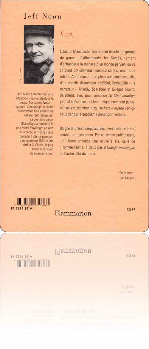 Jeff NoonVurtdans l'édition : Flammarion › Littérature étrangère, 1997[ 1 ] [ 2 ]de :Jeff Noontitre :Vurtsous une couverture de :Joe Mageeédition :France › Paris : Flammarion › Littérature étrangèretype, date et codification :volume simple, mai 1997 (avril 1997), ISBN 2-08-067136-7description matérielle :432 pages, broché, 13×21 cmpar ailleurs :amazon.frbnf.frnoosfere.orgnotice :frxliizoFvj0tzWfi9u80zrOXLUW6oYtTcontenutextes : 1fiction : 1rédactionnel : 0francophone : 0traduit : 15‑419 → Jeff Noon : Vurt (1993 ↬ 1997)