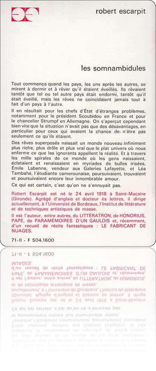 Robert Escarpitles Somnambidulesdans l'édition : Flammarion, 1971[ 1 ] [ 2 ]de :Robert Escarpittitre :les Somnambidulesédition :France › Paris : Flammarion › [sans collection]type, date et codification :volume simple, premier trimestre 1970 [premier trimestre 1971] (janvier 1971), ISBN 2-08-non-codifiédescription matérielle :224 pages, broché, 12×18 cmpar ailleurs :amazon.frbnf.frbooks.google.frnotice :frxlii97xo970vM3NEEAqwnUHRdK60RxJcontenutextes : 1fiction : 1rédactionnel : 0francophone : 1traduit : 03‑219 → Robert Escarpit : les Somnambidules (1971)