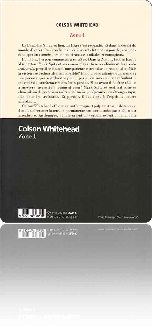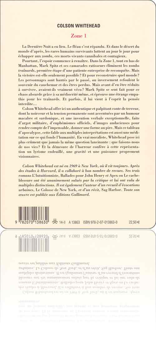 Colson WhiteheadZone 1dans l'édition : Gallimard › Du monde entier, 2014[ 1 ] [ 2 ] [ 3 ] [ 4 ]de :Colson Whiteheadtitre :Zone 1sous une couverture de :S.J. Harmonédition :France › Paris : Gallimard › Du monde entiertype, date et codification :volume simple, janvier 2014 (15 janvier 2014), ISBN 978-2-07-013863-0description matérielle :352 pages, broché avec bande, 14×20 cmpar ailleurs :amazon.frbnf.frbooks.google.frgallimard.frnoosfere.orgnotice :frxliiaa9BVkKtYTeGFBxfYh1C2w3jOSVcontenutextes : 1fiction : 1rédactionnel : 0francophone : 0traduit : 15‑338 → Colson Whitehead : Zone 1 (2011 ↬ 2014)