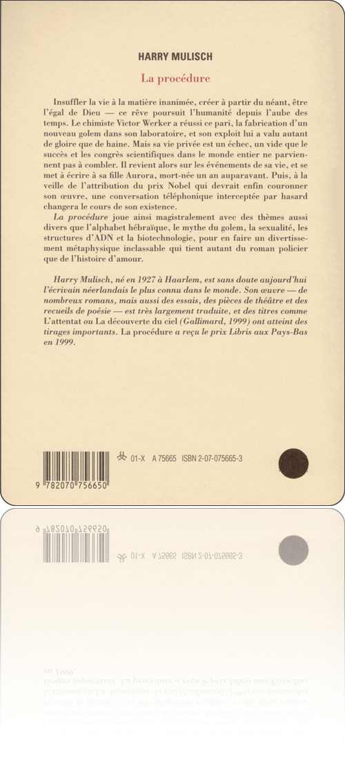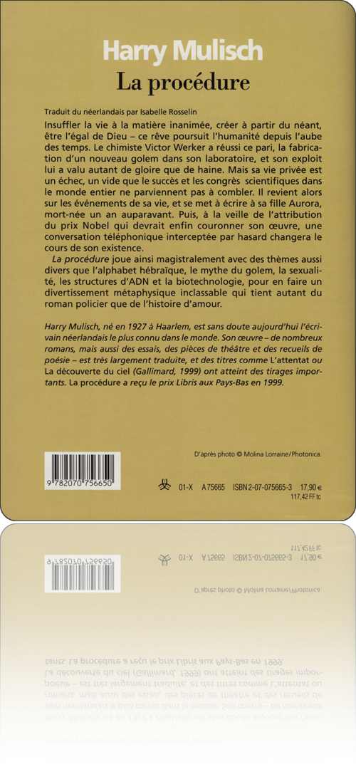 Harry Mulischla Procéduredans l'édition : Gallimard › Du monde entier, 2001[ 1 ] [ 2 ] [ 3 ] [ 4 ]de :Harry Mulischtitre :la Procéduresous une couverture de :Molina Lorraineédition :France › Paris : Gallimard › Du monde entiertype, date et codification :volume simple, septembre 2001 (17 septembre 2001), ISBN 2-07-075665-3description matérielle :288 pages, broché avec jaquette, 14×20 cmpar ailleurs :amazon.frbnf.frbooks.google.frgallimard.frnotice :frxliigD0AIjZs24WYk66a50kvKTiW650contenutextes : 1fiction : 1rédactionnel : 0francophone : 0traduit : 17‑288 → Harry Mulisch : la Procédure (1998 ↬ 2001)