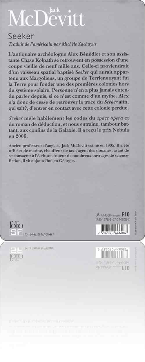 Jack McDevittSeekerdans l'édition : Gallimard › Folio Science-Fiction, nº 467, 2013[ 1 ] [ 2 ]de :Jack McDevitttitre :Seekersous une couverture de :Alain Brionédition :France › Paris : Gallimard › Folio Science-Fiction, nº 467type, date et codification :volume simple, octobre 2013 (12 octobre 2013), ISBN 978-2-07-044608-7description matérielle :560 pages, broché, 11×18 cmpar ailleurs :amazon.frbnf.frfolio-lesite.frnoosfere.orgnotice :frxliifYXJvhJXZJbG1lYqDWrbtdjF4lXcontenutextes : 1fiction : 1rédactionnel : 0francophone : 0traduit : 15‑545 → Jack McDevitt : Seeker (2005 ↬ 2011)