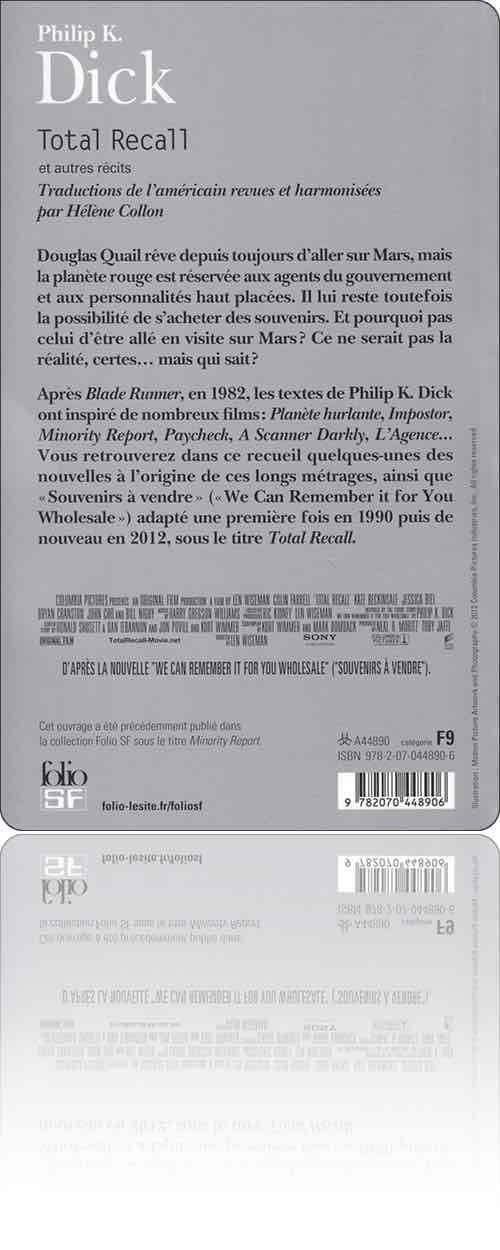 La couverture reprend une scène de Mémoires programmées, adaptation cinématographique par Len Wiseman (Total recall, 2012).