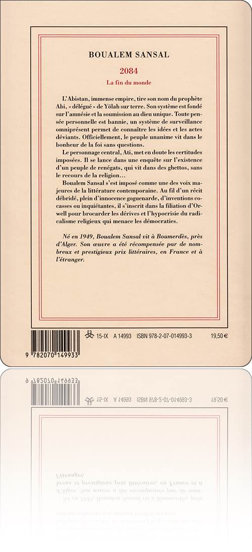 Boualem Sansal2084dans l'édition : Gallimard › [la Blanche], 2015[ 1 ] [ 2 ]de :Boualem Sansaltitre :2084édition :France › Paris : Gallimard › [la Blanche]type, date et codification :volume simple, juin 2015 (16 juin 2015), ISBN 978-2-07-014993-3description matérielle :288 pages, broché, 14×20 cmpar ailleurs :amazon.frbnf.frbooks.google.frgallimard.frnoosfere.orgnotice :frxliiwk3qWjTswLU4xvAu7kx1YrhCu1econtenutextes : 1fiction : 1rédactionnel : 0francophone : 1traduit : 07‑274 → Boualem Sansal : 2084 : la fin du monde (2015)