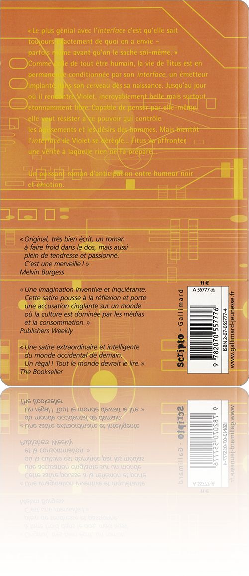 M.T. AndersonInterfacedans l'édition : Gallimard Jeunesse › Scripto, 2004[ 1 ] [ 2 ]de :M.T. Andersontitre :Interfacesous une couverture de :[Anonyme]édition :France › Paris : Gallimard Jeunesse › Scriptotype, date et codification :volume simple, octobre 2004, ISBN 2-07-055777-4statut :à destination de la jeunessedescription matérielle :288 pages, broché, 13×20 cmpar ailleurs :amazon.frbnf.frbooks.google.frgallimard-jeunesse.frnoosfere.orgnotice :frxliihRDQN8me3wMNyM7PTfOUzrzdDticontenutextes : 1fiction : 1rédactionnel : 0francophone : 0traduit : 13‑279 → M.T. Anderson : Interface (2002 ↬ 2004)