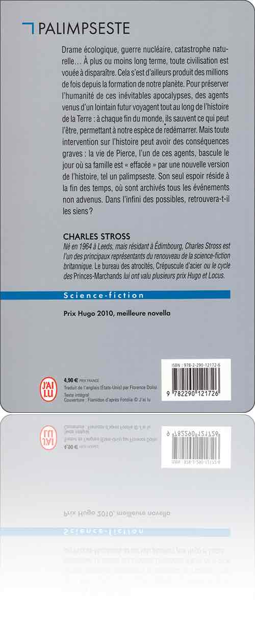 Charles StrossPalimpsestedans l'édition : J'ai lu › Science-Fiction, nº 11325, 2015[ 1 ] [ 2 ]de :Charles Strosstitre :Palimpsestesous une couverture de :Flamidonédition :France › Paris : J'ai lu › Science-Fiction, nº 11325type, date et codification :volume simple, décembre 2015 (7 décembre 2015), ISBN 978-2-290-12172-6description matérielle :128 pages, broché, 11×18 cmpar ailleurs :amazon.frbnf.frjailu.comnoosfere.orgnotice :frxlii3lE06xAiMifUxyo5n1e6g882JDHcontenutextes : 1fiction : 1rédactionnel : 0francophone : 0traduit : 15‑127 → Charles Stross : Palimpseste (2009 ↬ 2011)