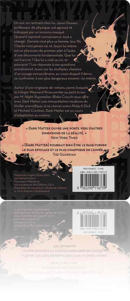 Blake CrouchDark matterdans l'édition : J'ai lu › Nouveaux millénaires, 2016[ 1 ] [ 2 ]de :Blake Crouchtitre :Dark mattersous une couverture de :[Anonyme]édition :France › Paris : J'ai lu › Nouveaux millénairestype, date et codification :volume simple, janvier 2017 (5 décembre 2016), ISBN 978-2-290-11673-9description matérielle :352 pages, broché, 13×20 cmpar ailleurs :amazon.frjailu.comnoosfere.orgnotice :frxliicqDZy5WqozGlenH92C3rLh0gTMCcontenutextes : 1fiction : 1rédactionnel : 0francophone : 0traduit : 15‑347 → Blake Crouch : Dark matter (2016 ↬ 2016)