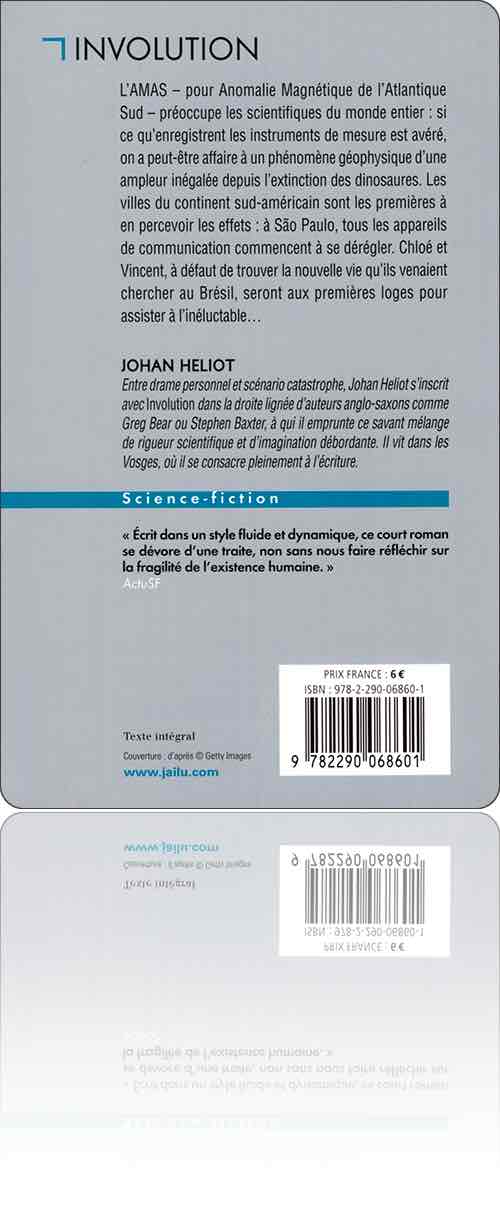 Johan HeliotInvolutiondans l'édition : J'ai lu › Science-Fiction, nº 11121, 2015[ 1 ] [ 2 ]de :Johan Heliottitre :Involutionsous une couverture de :[Anonyme]édition :France › Paris : J'ai lu › Science-Fiction, nº 11121type, date et codification :volume simple, avril 2015 (13 avril 2015), ISBN 978-2-290-06860-1description matérielle :224 pages, broché, 11×18 cmpar ailleurs :amazon.frbnf.frbooks.google.frjailu.comnoosfere.orgnotice :frxliiafpwQVMCKApbEsE7h3lWFP6vC4Tcontenutextes : 1fiction : 1rédactionnel : 0francophone : 1traduit : 05‑220 → Johan Heliot : Involution (2013)