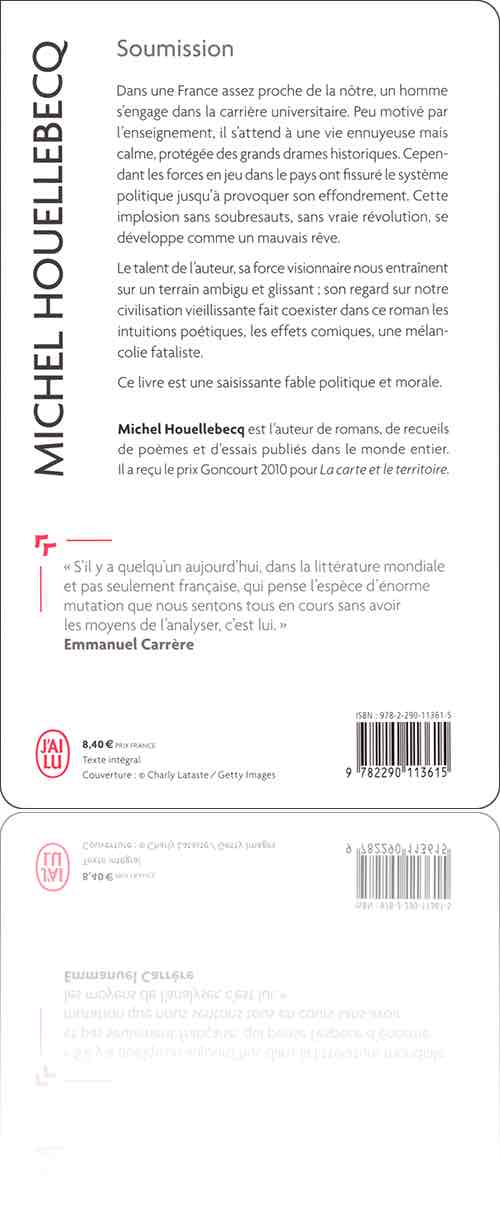 Michel HouellebecqSoumissiondans l'édition : J'ai lu, nº 11631, 2016[ 1 ] [ 2 ]de :Michel Houellebecqtitre :Soumissionsous une couverture de :Charly Latasteédition :France › Paris : J'ai lu › [sans collection], nº 11631type, date et codification :volume simple, décembre 2016 (4 décembre 2016), ISBN 978-2-290-11361-5description matérielle :320 pages, broché, 11×18 cmpar ailleurs :amazon.frbnf.frjailu.comnotice :frxliiiveSTzW3uf3KRRhRVBfM6Lf3S31contenutextes : 1fiction : 1rédactionnel : 0francophone : 1traduit : 05‑315 → Michel Houellebecq : Soumission (2014)