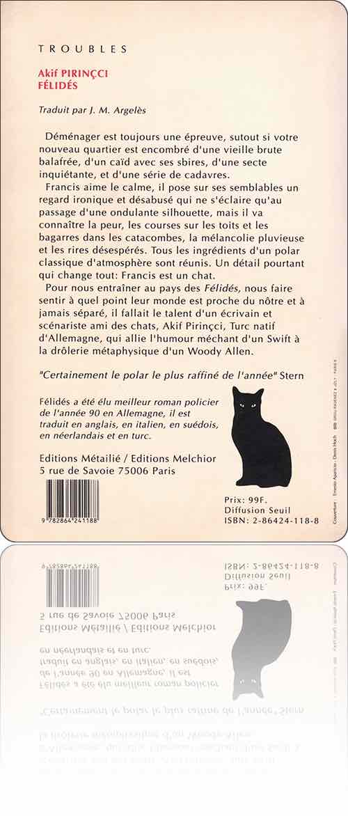Akif PirinçciFélidésdans l'édition : Métailié › Troubles & Melchior, 1992[ 1 ] [ 2 ]de :Akif Pirinçcititre :Félidéssous une couverture de :Ernesto Aparicio & Denis Hochédition :France › Paris : Métailié › Troubles & Suisse › Genève : Melchior › [sans collection]type, date et codification :volume commenté, janvier 1992, ISBN 2-86424-118-8description matérielle :264 pages, broché, 14×23 cmpar ailleurs :amazon.frbnf.freditions-metailie.comnotice :frxliiq2EtQQVM6bisDWGEVbGozuoT6y7contenutextes : 1fiction : 1rédactionnel : 0francophone : 0traduit : 13‑245 → Akif Pirinçci : Félidés (1989 ↬ 1992)