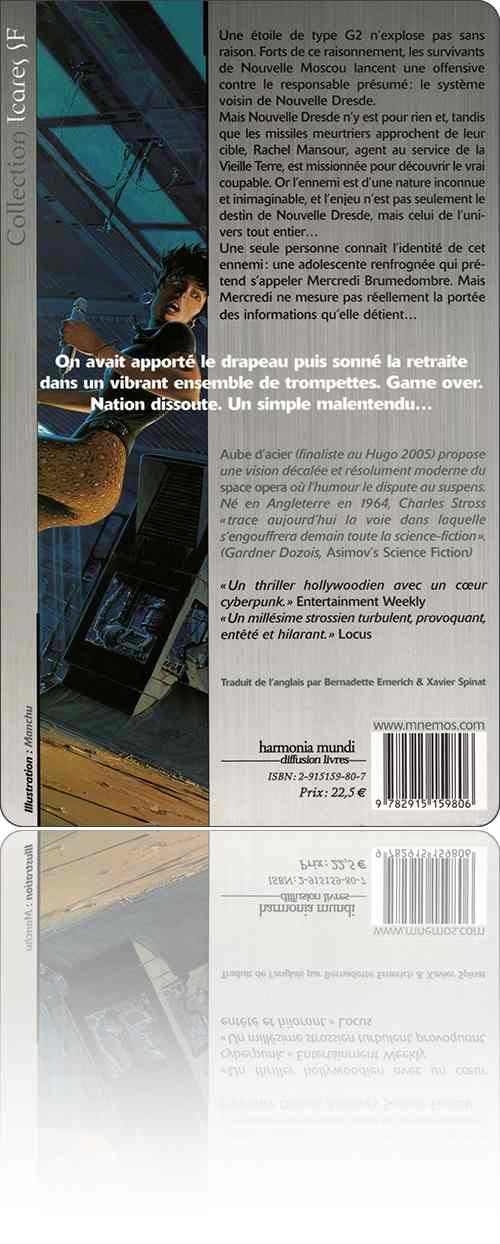 Charles StrossAube d'acierdans l'édition : Mnémos › Icares SF, 2006[ 1 ] [ 2 ]de :Charles Strosstitre :Aube d'aciersous une couverture de :Manchuédition :France › Paris : Mnémos › Icares SFtype, date et codification :volume simple, juin 2006 (mai 2006), ISBN 2-915159-80-7description matérielle :480 pages, broché, 13×22 cmpar ailleurs :amazon.frbnf.frbooks.google.frnoosfere.orgnotice :frxliigvjRT0cMJ4tJVBe4IsgA3BvM4NUcontenutextes : 1fiction : 1rédactionnel : 0francophone : 0traduit : 13‑472 → Charles Stross : Aube d'acier (2004 ↬ 2006)
